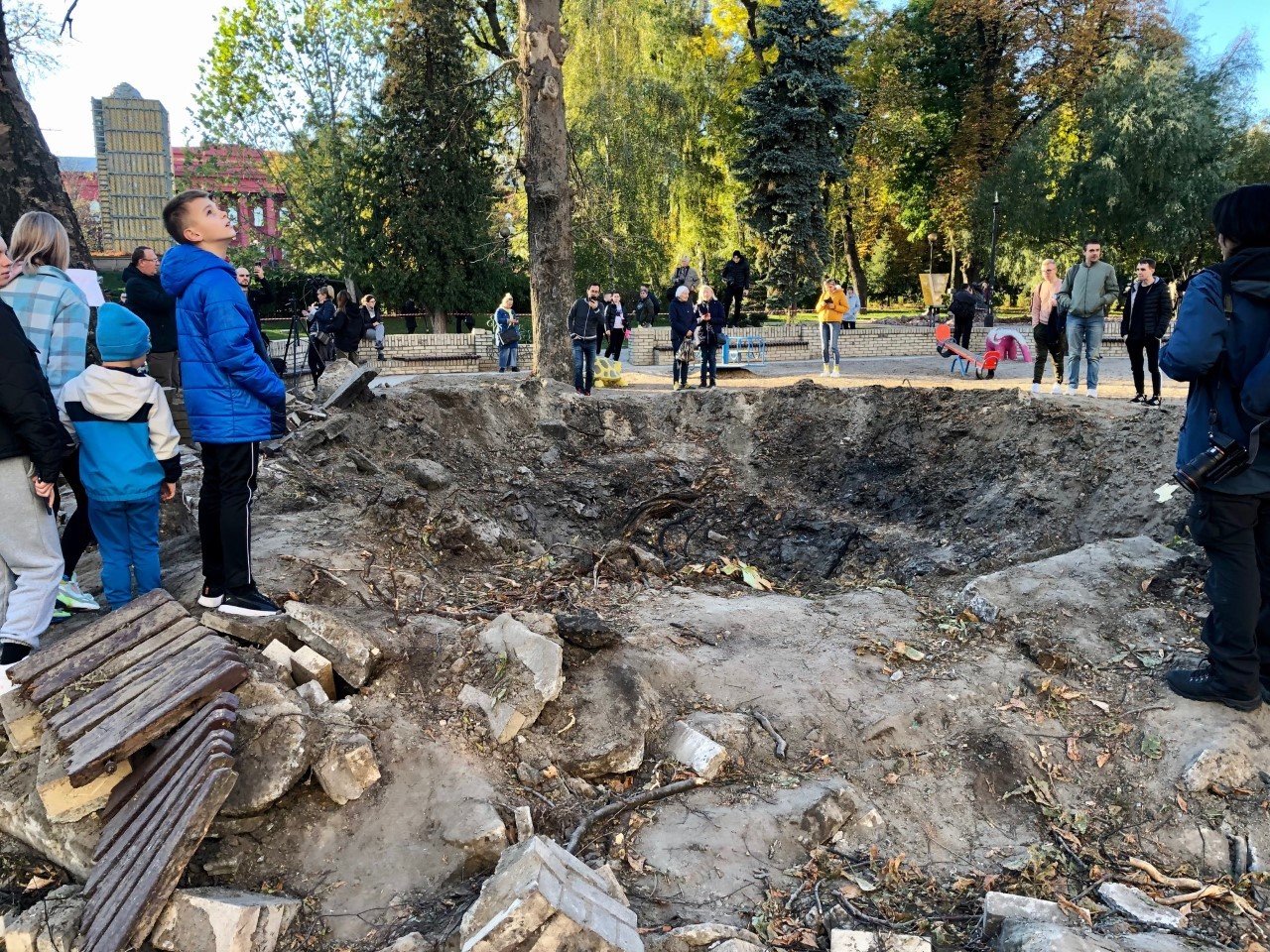 The crater left by a Russian missile, which hit a playground in Kyiv's Shevchenko Park on Oct. 10, 2022. Photo by Nolan Peterson/Coffee or Die.